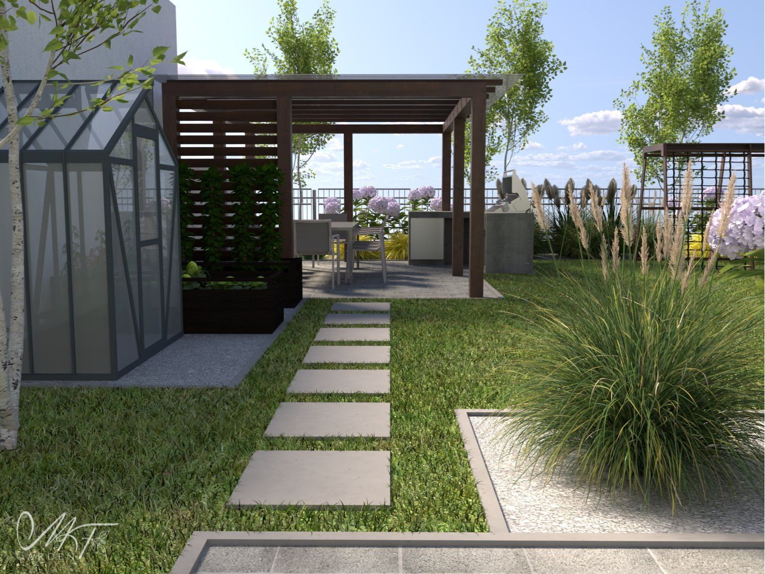 Na tarasie zaprojektowano drewnianą pergolę, którą otacza nieduża rabata z traw ozdobnych utrzymana w odcieniach fioletu. Znajdziemy tu miejsce na sobotnie śniadanie z rodziną jak i wypoczynek przy popołudniowym latte.