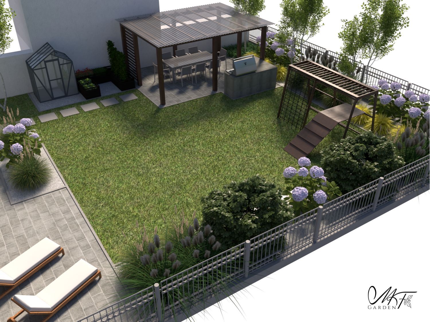 Ogród przydomowy charakteryzuje się eleganckimi rabatami w odcieniach fioletu i bieli. Centralnym punktem jest taras wyposażony w wygodne krzesła, idealny do relaksu i spotkań towarzyskich. Obok tarasu znajduje się pergola z miejscem wypoczynkowym, zapewniająca przyjemny cień i intymność. W ogrodzie wydzielono również specjalne miejsce, gdzie w przyszłości planowane jest zainstalowanie jacuzzi, co doda przestrzeni dodatkowej funkcjonalności i luksusu.
